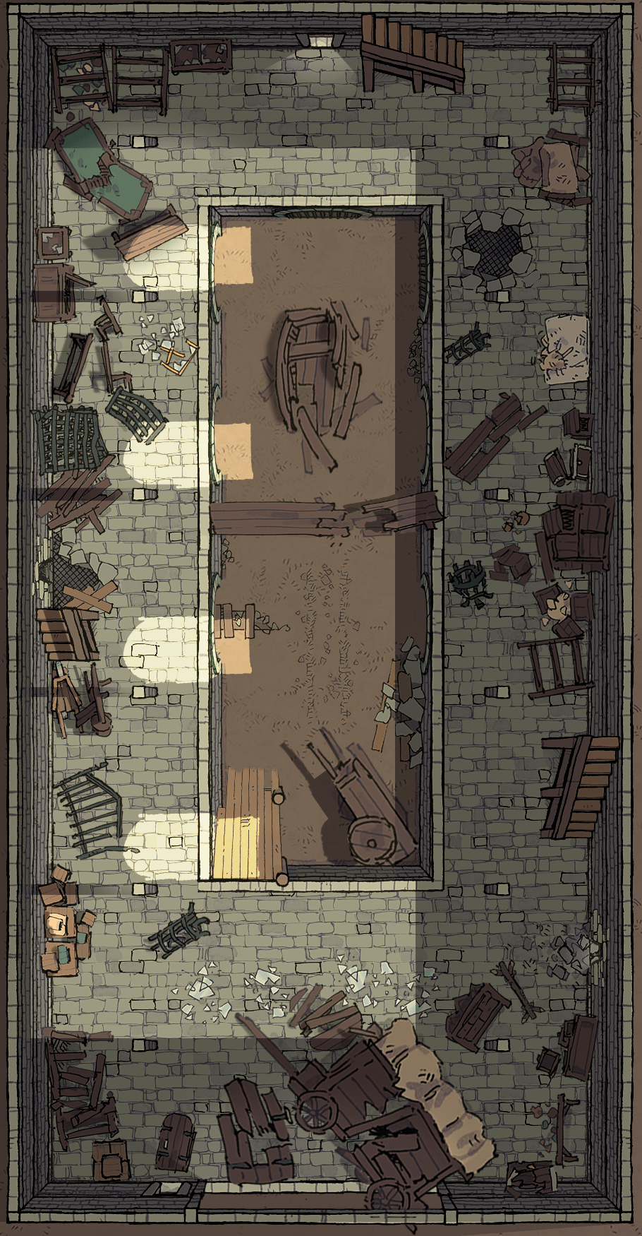 * The wooden walkway (second story) is about \~5 meters (15 to 20ft) away and is accessed by the stairs (the left one is broken and doesn't reach the walkway and is above a hole that leads to the "vault room" below, you can add a d6 of fall damage to a clumsy PC if you feel particularly evil). The handrail is gone in some parts, beware. The office above the main entrance has holes in the floor through which a character can fly/levitate in, also the "windows" provide a view of almost all the warehouse length below.