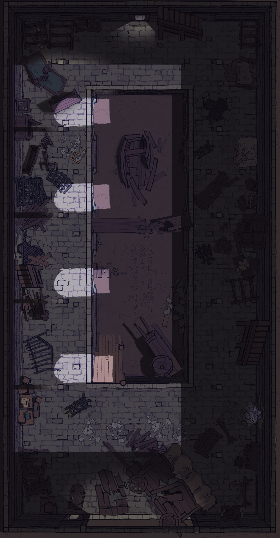 [Here I leave you a battlemap of a abandoned warehouse](https://drive.google.com/drive/folders/12XOSk63xRZe_5OYdZyI7tbUyG4NRgdrZ?usp=drive_link) (roughly 13x26) made with [2minutetabletop](https://2minutetabletop.com/) assets.