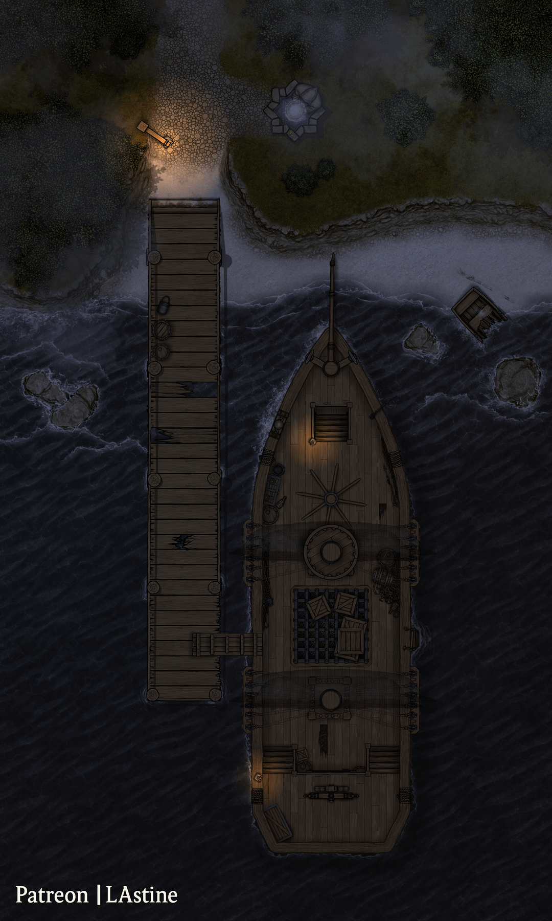 Here's a map of a foggy dock where an old ship is moored. Perfect for a mysterious arrival on a remote island or haunted territory.
