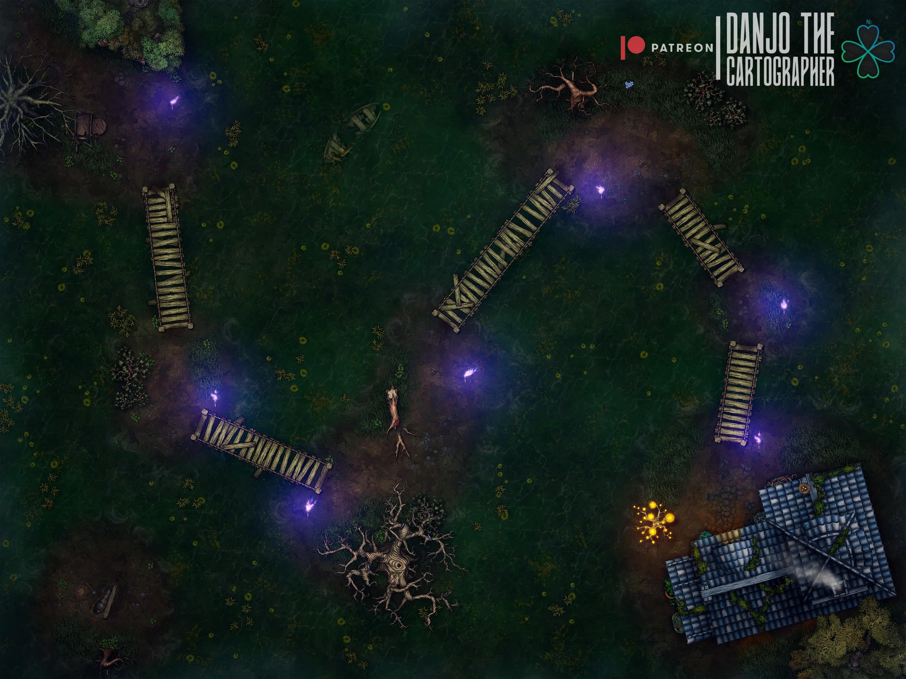 *Eventually, the path leads to a well-kept little house that beams with inviting light from its windows. Outside the door grows a strange Feywild tree decorated with glowing orbs of light that shimmer against the dark waters. A steady stream of smoke rises from the chimney, a clear sign that the resident is home and the fire is lit. This cozy sight stands in stark contrast to the murky wetlands behind you, beckoning travelers toward the warmth of the witch’s hearth.*