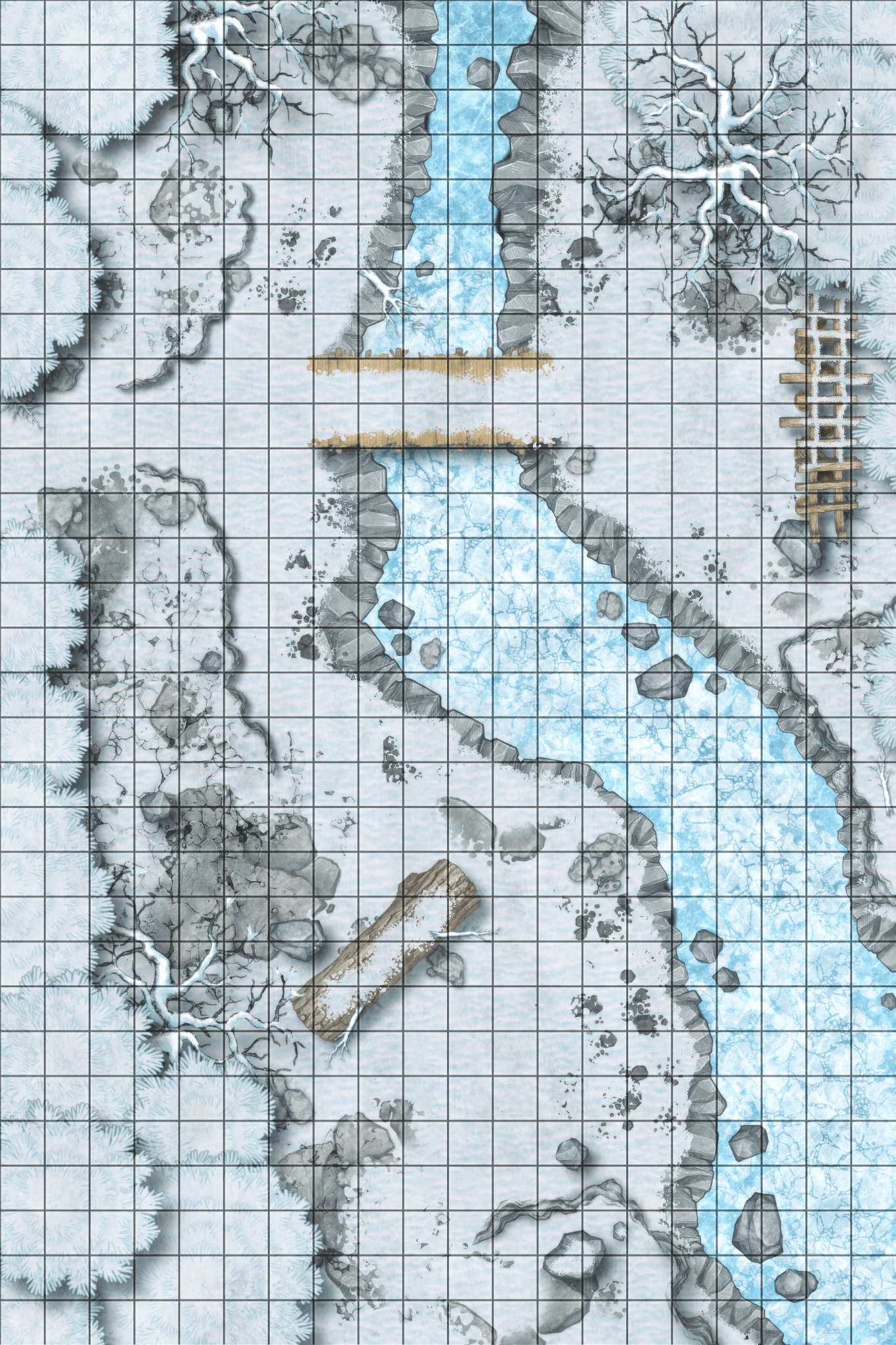 A snow cloaked shrine perfect for a Yuki Onna, or some other sub-zero threat your party may encounter. Send a conal down the bridge if they gather, or ask for skill save if they dare to skate across the icy river. Maybe a lair action to combat the ever growing cold? Toss me your ideas.