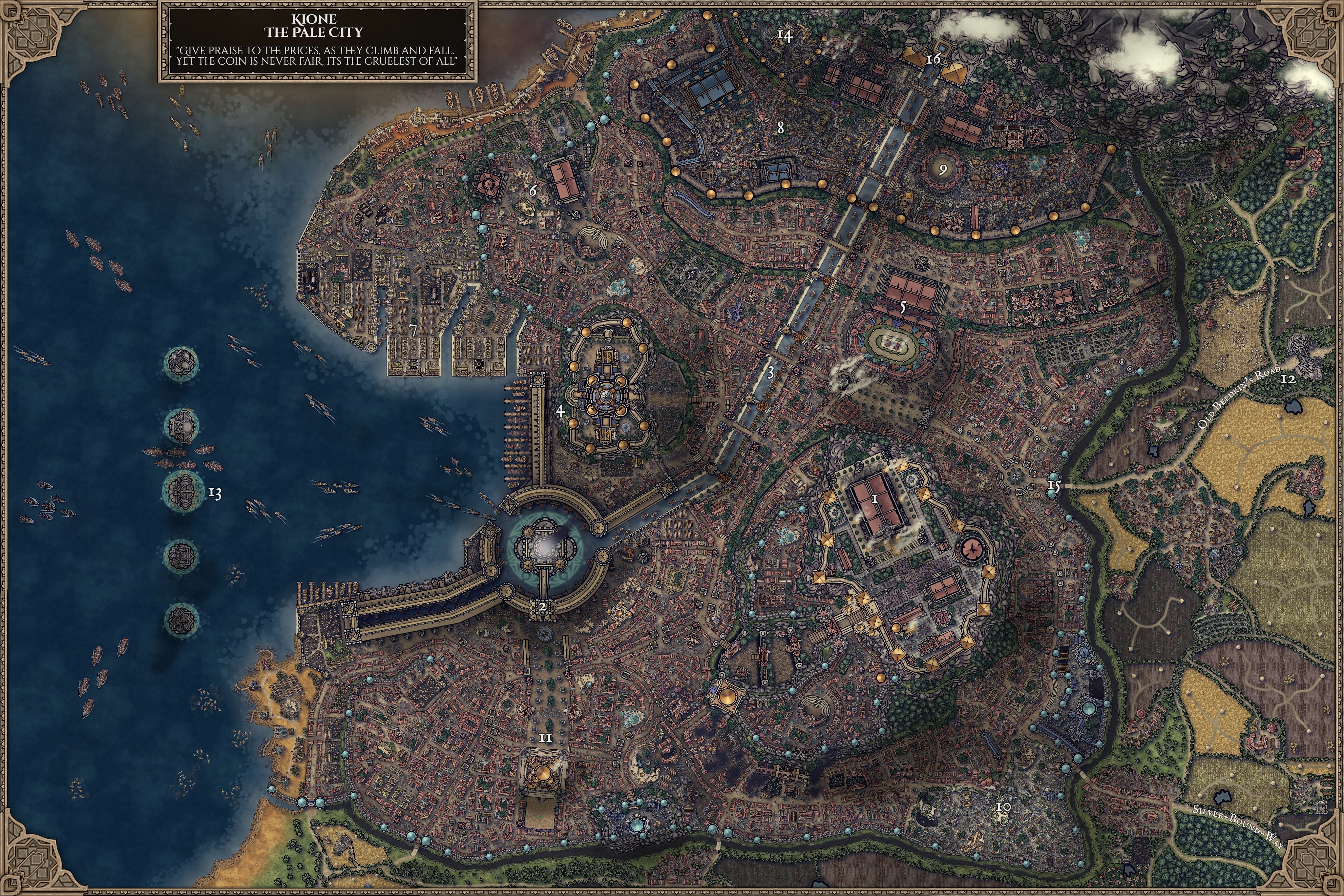16. *Kharun Orethane's Gate - The gateway to the carved out undercity of Kione. Where Khar darin's, for example, was simply modeled and stabilized in a former caldera. Kione carved into the mountain itself using combustion runes and magics. This gate leads to the shipyards, drydocks, granaries, and storehouses, which provide for the city in times of crisis. Water to the cavern is moved along aqueducts from the peaks above, through carved out veins into the under-harbor, and then regulated by guildsmen assigned to maintain its water flow and level.*