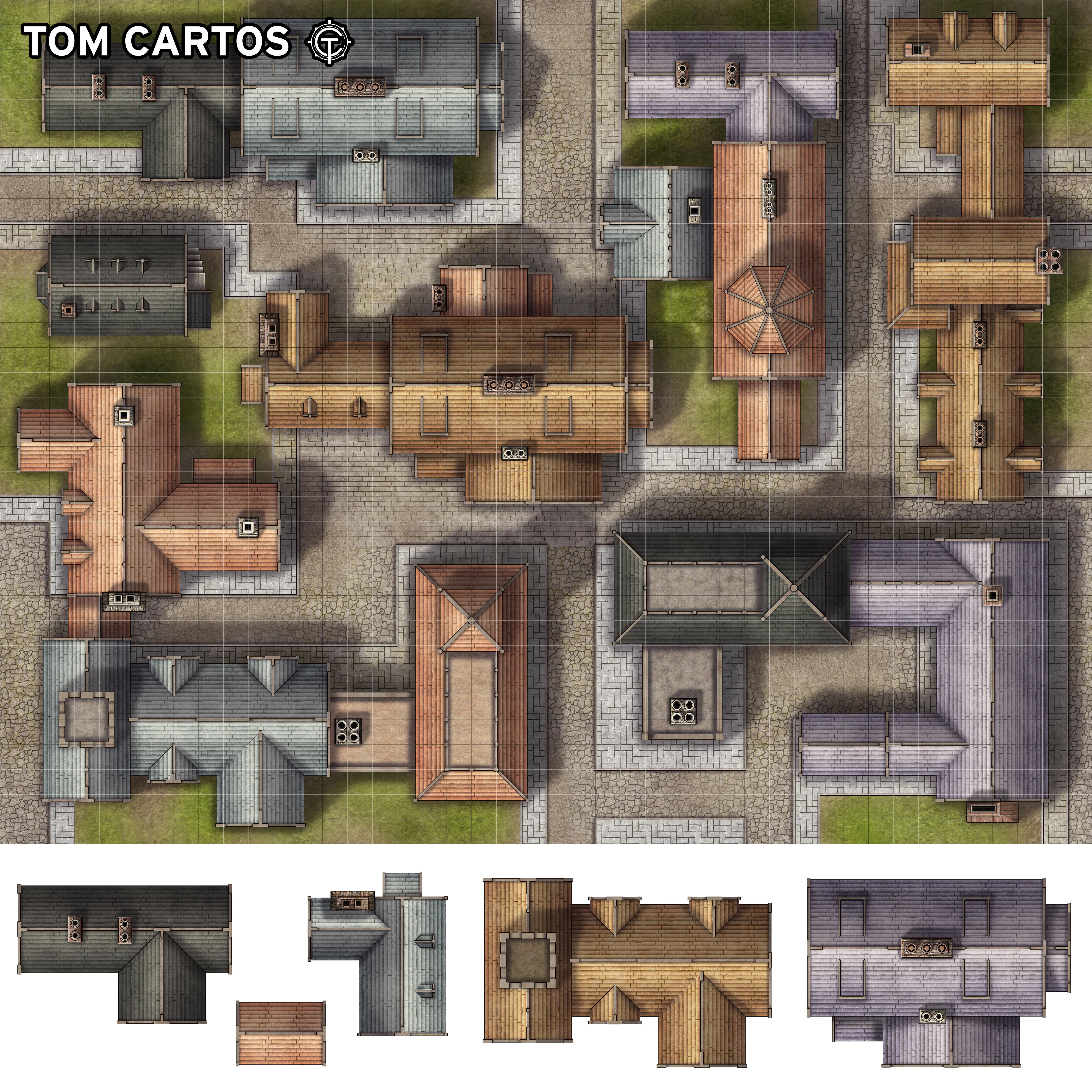 Hello travelers! This is the free version of my latest [Patreon](https://www.patreon.com/tomcartos) map set as part of the Into the Wilds Tactical Tiles series! These modular rooftops can be plotted down onto any map to make for a town, village, or standalone building to drop into your your campaign's landscape. The complete set includes over 100 different tiles of varying sizes and colors depicting a variety of building types and patterns for my patrons. **You can download the free sample set of building tiles and the example map** [**HERE!**](https://www.patreon.com/posts/rooftop-tactical-149160681)