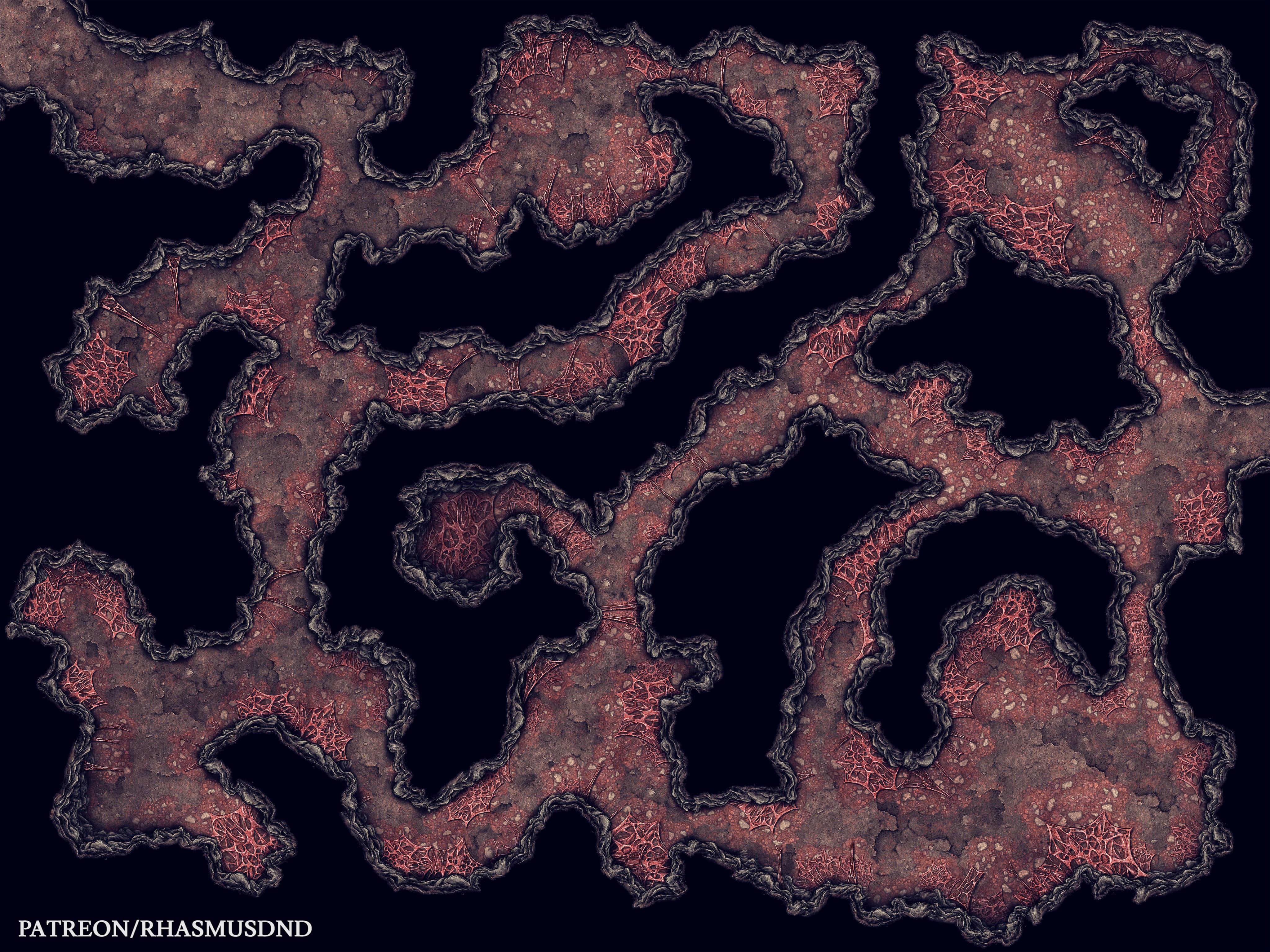 Deep beneath the surface, these winding caverns twist and coil like veins through the earth itself. Strange crimson growths cling to the stone walls, pulsing faintly in the darkness, as if the cave were somehow alive—or feeding on something unseen.
