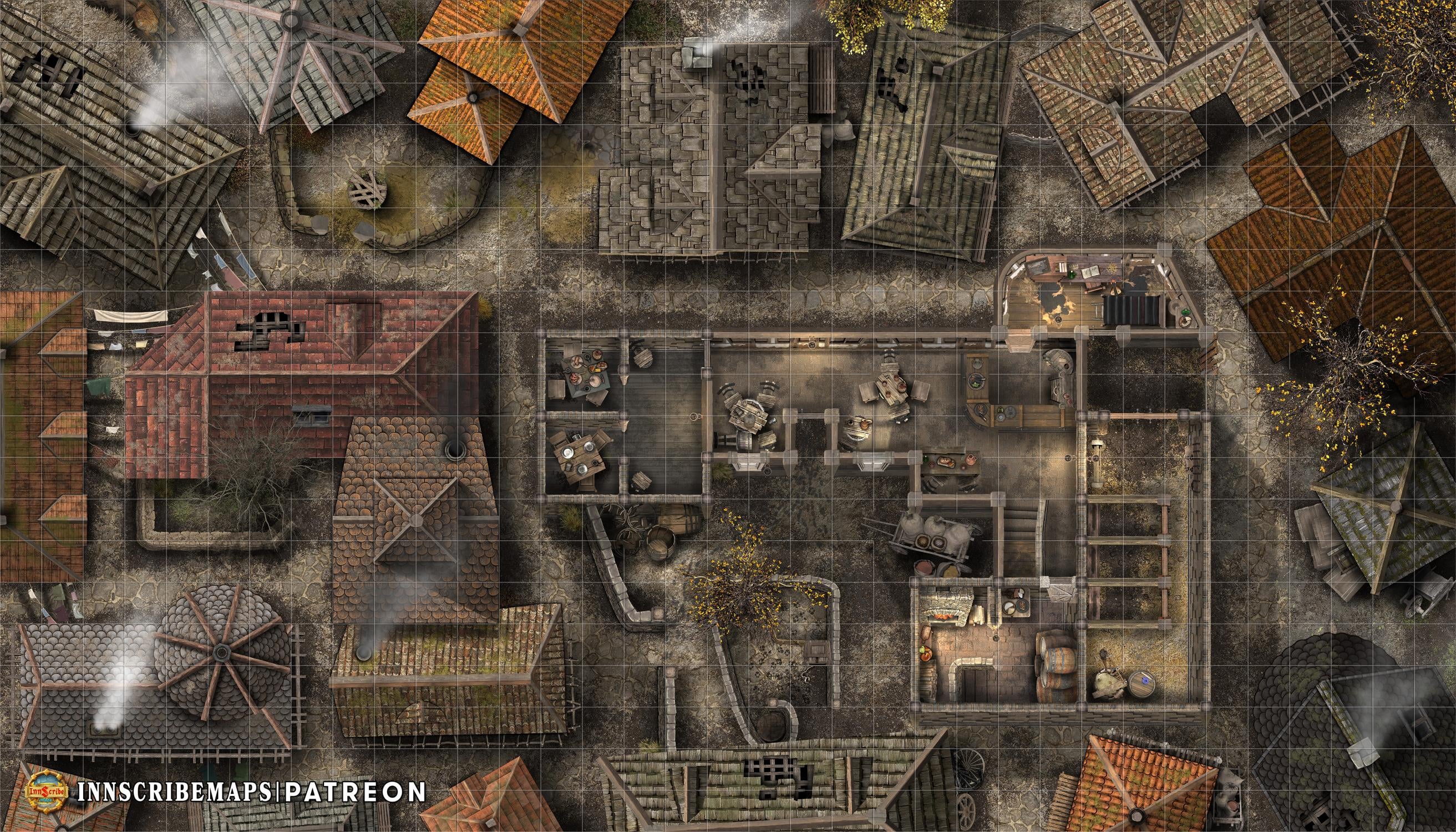 [Art] Cracked Cup Tavern – the grimy slums inn where your party finds trouble they can't refuse. Welcome to the 'Quiet' tavern that definitely isn't a mercenary hideout & it most certainly does not have a SECRET MERCS TRIAL PIT in the basement