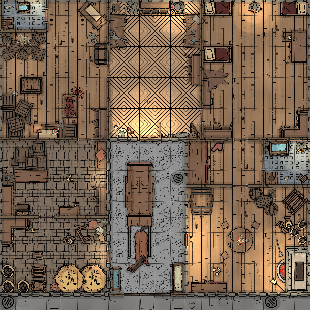 I created this map for the *Phandelver and Below* campaign. I decided to start the adventure with a prequel where the heroes meet at a location I designed: the Rockseeker brothers' workshop in Neverwinter. My goal was to have the players gather the supplies listed in the adventure from various rooms while fighting off rats crawling out of the sewer grates. This way, I can teach new players all the basic mechanics before the dangerous hook at the start of the main campaign.
