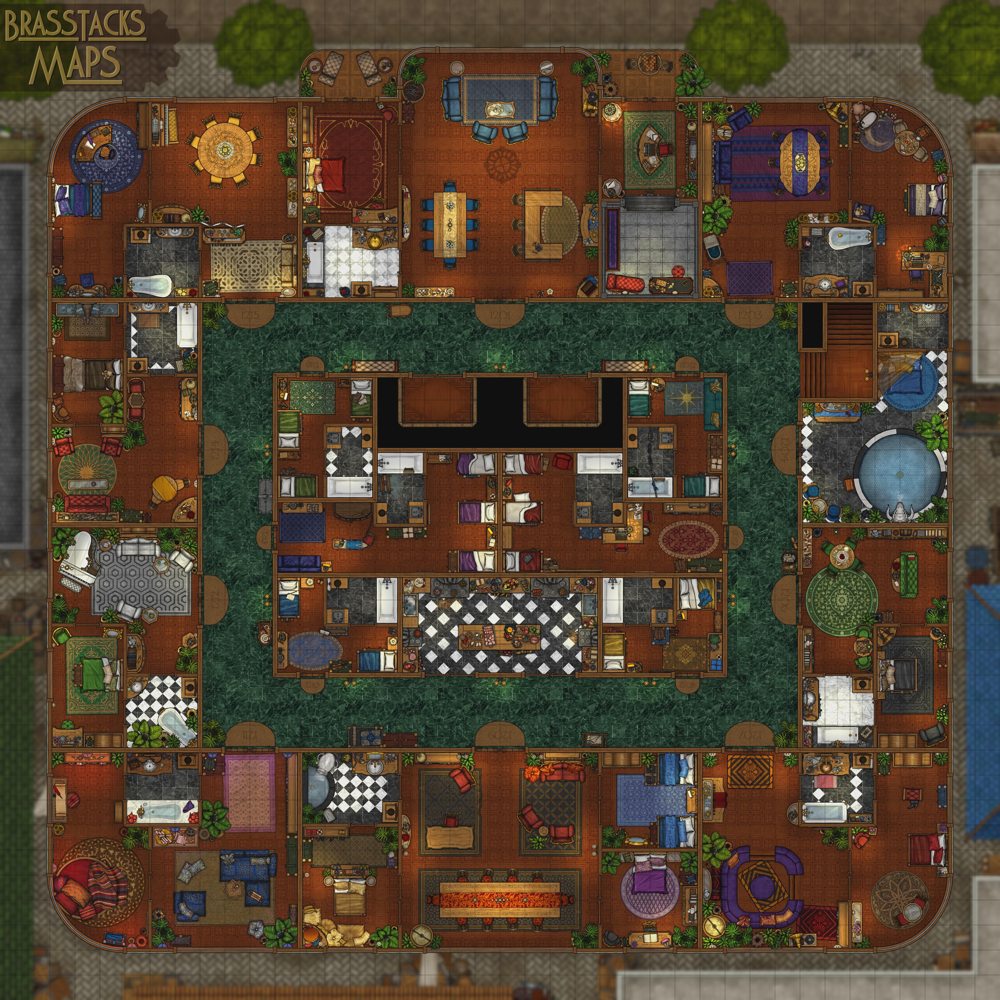 The **Luxury Hotel, 12th Floor** (40x40 100dpi) has arrived, dripping with opulence. This top floor, accessible by stairwell or elevator, features ten luxury guest suites and six guest quarters, along with a full chef's kitchen. No two rooms are alike, highlighted by the north-facing *Royal Suite* with space for entertaining and a secure vault room, and the south-facing *Heroes' Suite* with room enough for a full party to rest and relax.