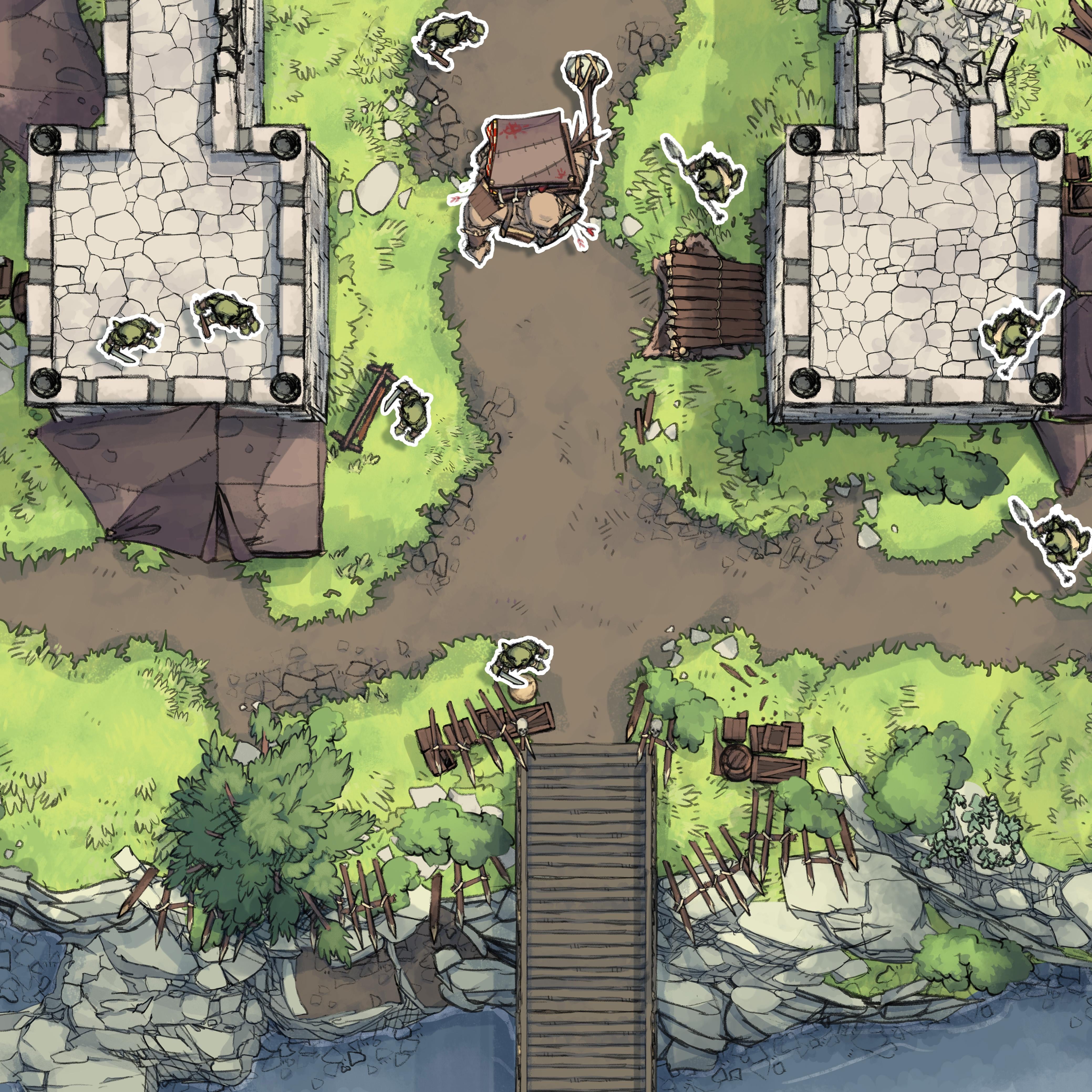 *Ahead, the dirt road ends at a rickety wooden footbridge, and across the stream, an encampment of ramshackle huts and hide tents pollute the crumbling stone battlements that once served as defenses for a temple. Sloppy barricades of hewn branches, bonfires and haunches of stolen farm animals roasting on spits. Even from across the river, the smell of a goblin camp is unmistakable. Any seeking to cross had better come prepared for battle, or an offer charming enough to placate these simple-minded raiders.*