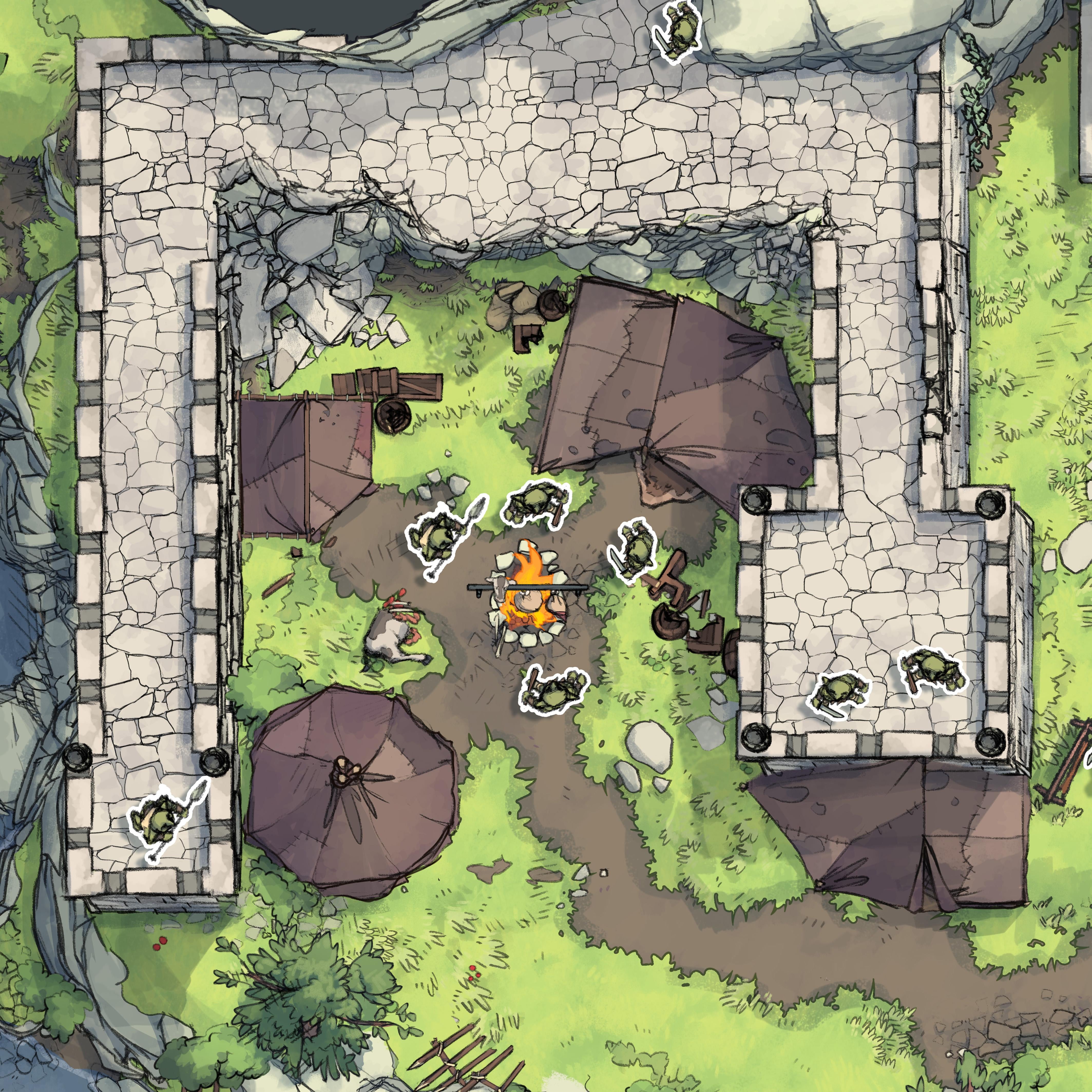 *Ahead, the dirt road ends at a rickety wooden footbridge, and across the stream, an encampment of ramshackle huts and hide tents pollute the crumbling stone battlements that once served as defenses for a temple. Sloppy barricades of hewn branches, bonfires and haunches of stolen farm animals roasting on spits. Even from across the river, the smell of a goblin camp is unmistakable. Any seeking to cross had better come prepared for battle, or an offer charming enough to placate these simple-minded raiders.*