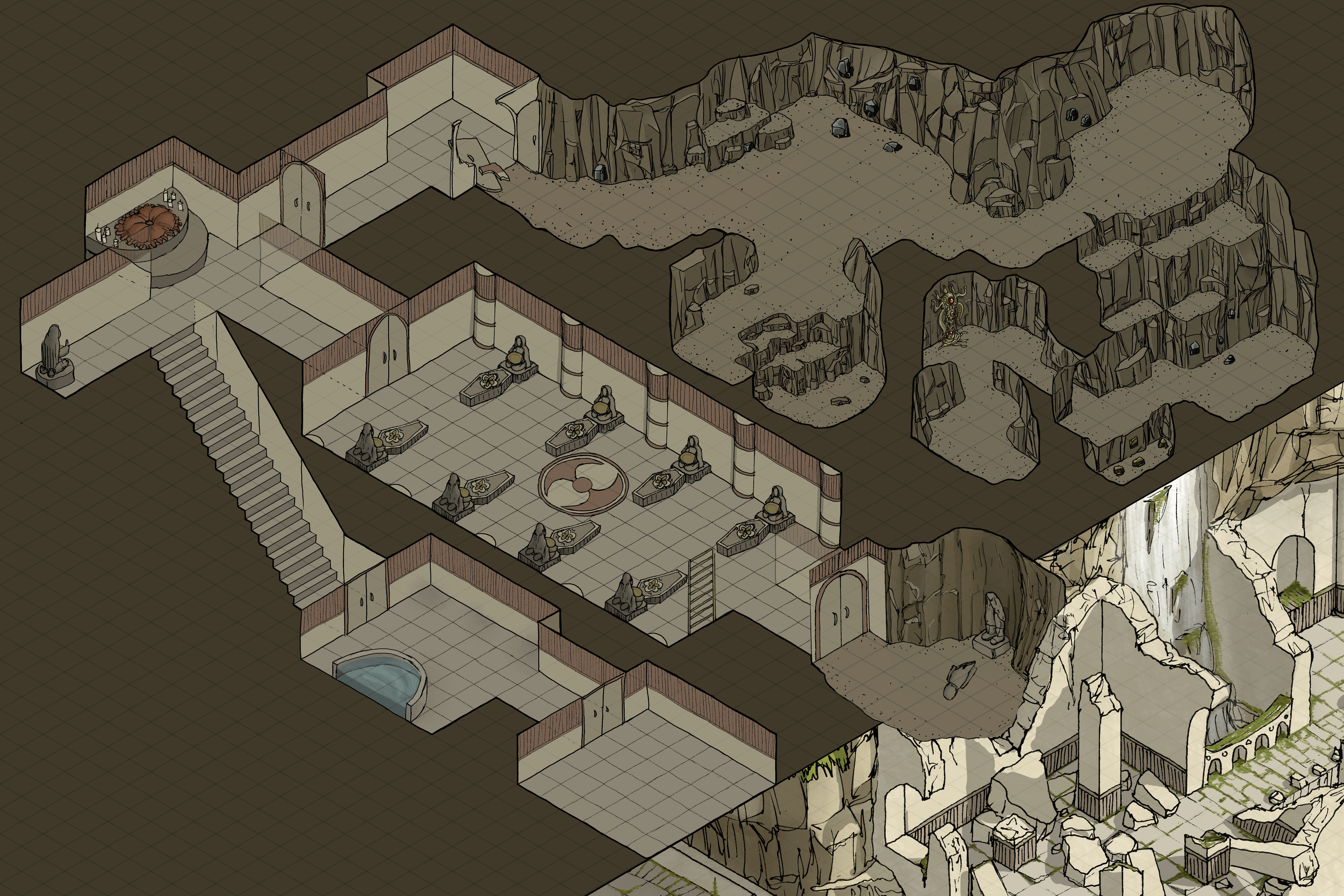 A crumble wall and a rusted hatch hide an ancient burial chamber where these individuals were buried with plenty of treasure. Protecting the chamber, hidden in the caves, is relic that reads and manifests a persons dreams and nightmares. Opening a sarcophagus may reveal yourself lying inside. Feared enemies wander the halls. These figments aren't just illusions though, and can be seen by the whole party and can attack dealing psychic damage. You have to destroy the relic before it destroys you.