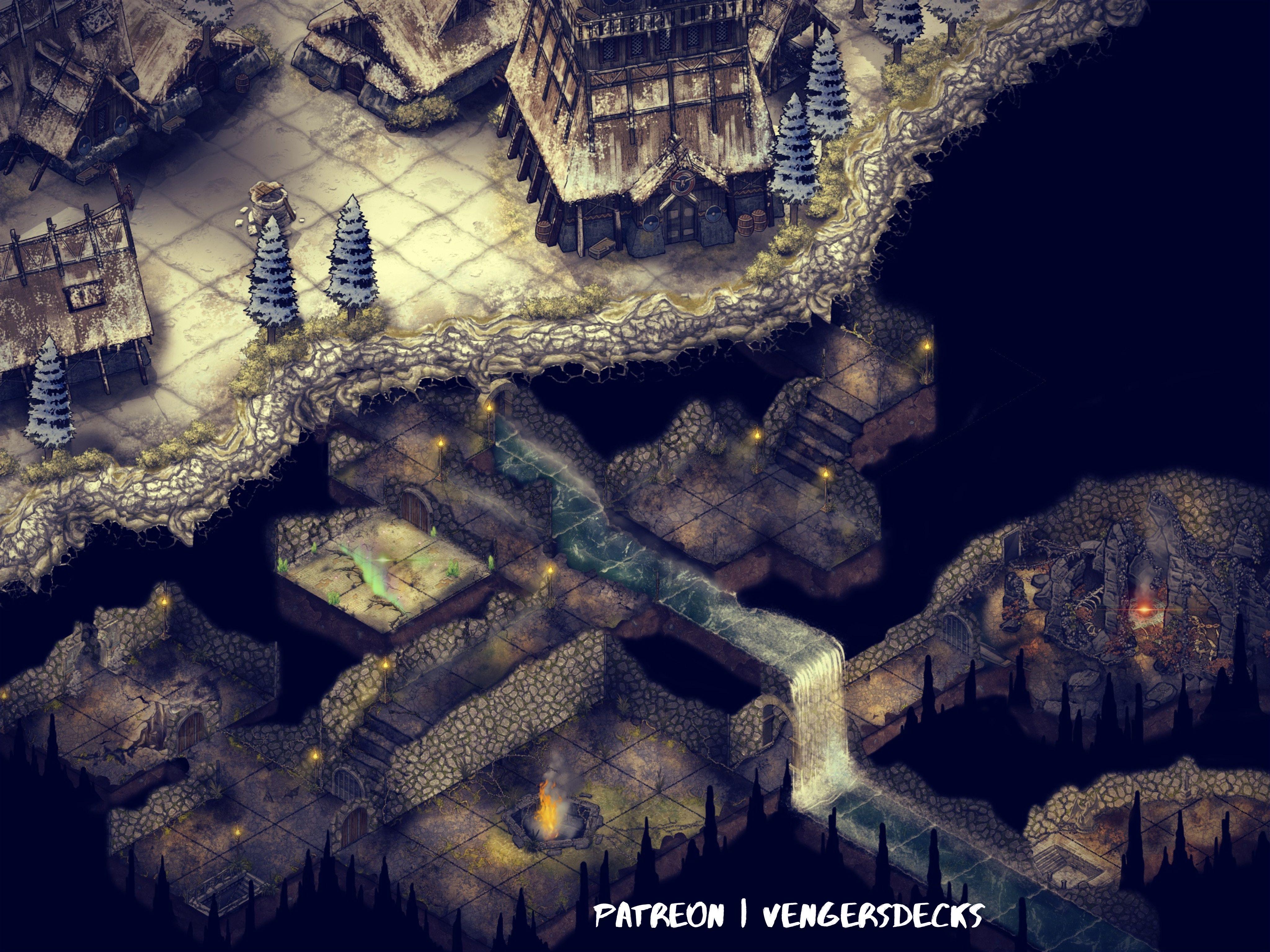 The idea is that not far beneath the surface of an old Viking-esque settlement, there might be a cellar leading into a long forgotten crypt dungeon, in which all manner of arcane or divine magicks have lain dormant for eons, but perhaps something has stirred them, and the party is tasked with exploring what in the Nine Hells is unfurling down there in the dense blackness. As the party moves through each section, maybe the lights begin to flicker up. The dungeon itself leads off in various directions, so who knows where those paths lead!...