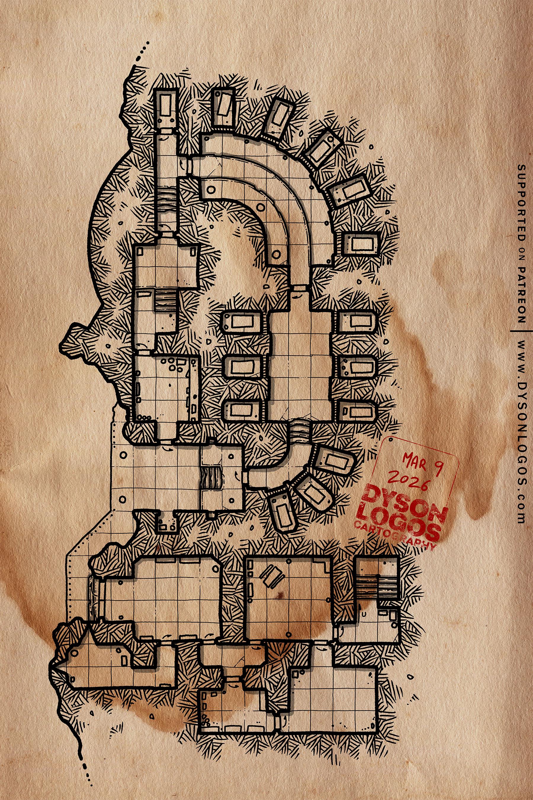 *The 1200 dpi versions of the map were drawn at a scale of 300 pixels per square and are 7,200 x 10,800 pixels (24 x 36 squares). To use this with a VTT you would need to resize the squares to either 70 pixels (for 5′ squares) or 140 pixels (for the recommended 10′ squares that match the description) – so resizing it to either 1,680 x 2,520 or 3,360 x 5,040, respectively.*
