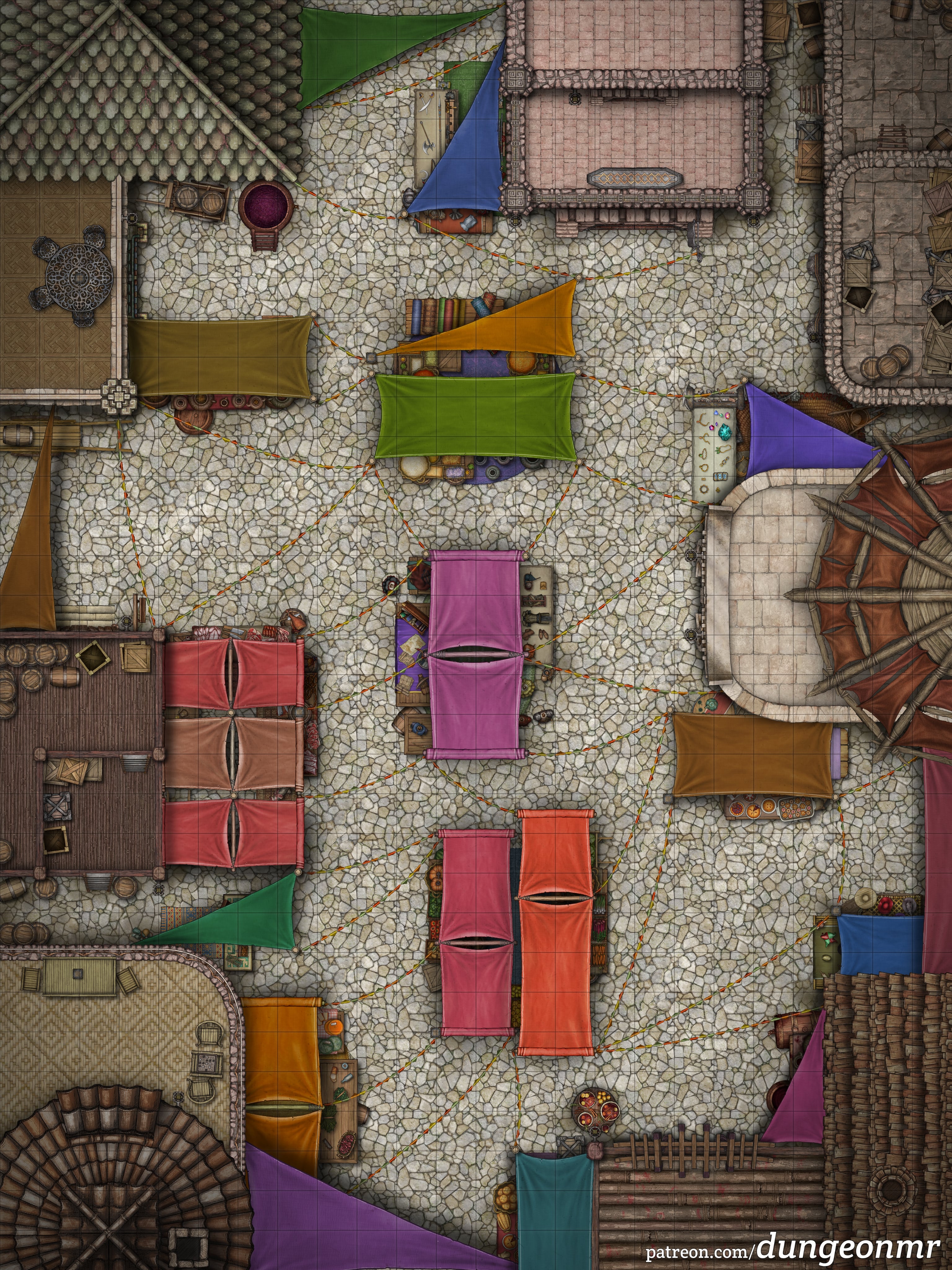 A lively market district filled with merchants, canopies, and tightly packed stalls. *The Bazaar* is designed as a flexible city hub—perfect for pickpocket chases, tense negotiations, street brawls, or simply giving your players a sense of a living, breathing city. The layered canopies create two distinct perspectives: the bustling lanes below and the rooftops above.
