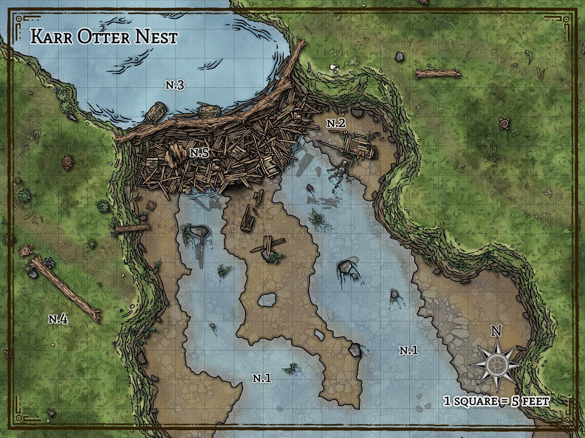 The nest is a mountainous ramshackle of wagon wheels, smashed barrels, and wooden planks stripped from structures and vehicles. Vicious karr otters prowl both within and without the nest, constantly adding more scrap to expand their home. It sits in the trench of a narrow section of the river about 20 miles upriver of Sanctus Paulus.
