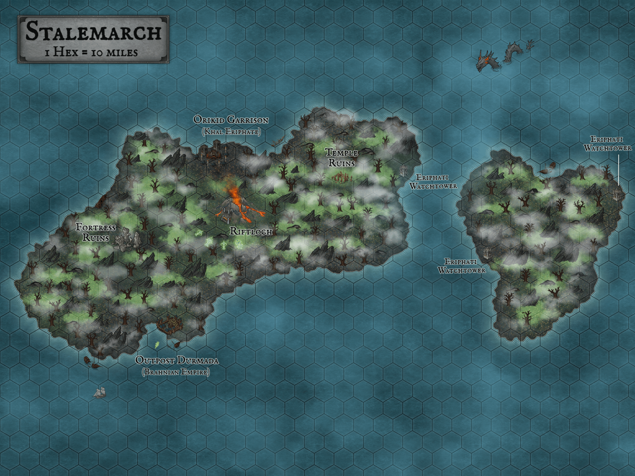 Since then, the Brahnian Empire and Khal Eriphate have established their respective outposts on the island, neither willing to cede this proverbial no-man's-land. However, the world's two great powers now teeter on the edge of conflict anew, and The Stalemarch is a powder keg awaiting its match.