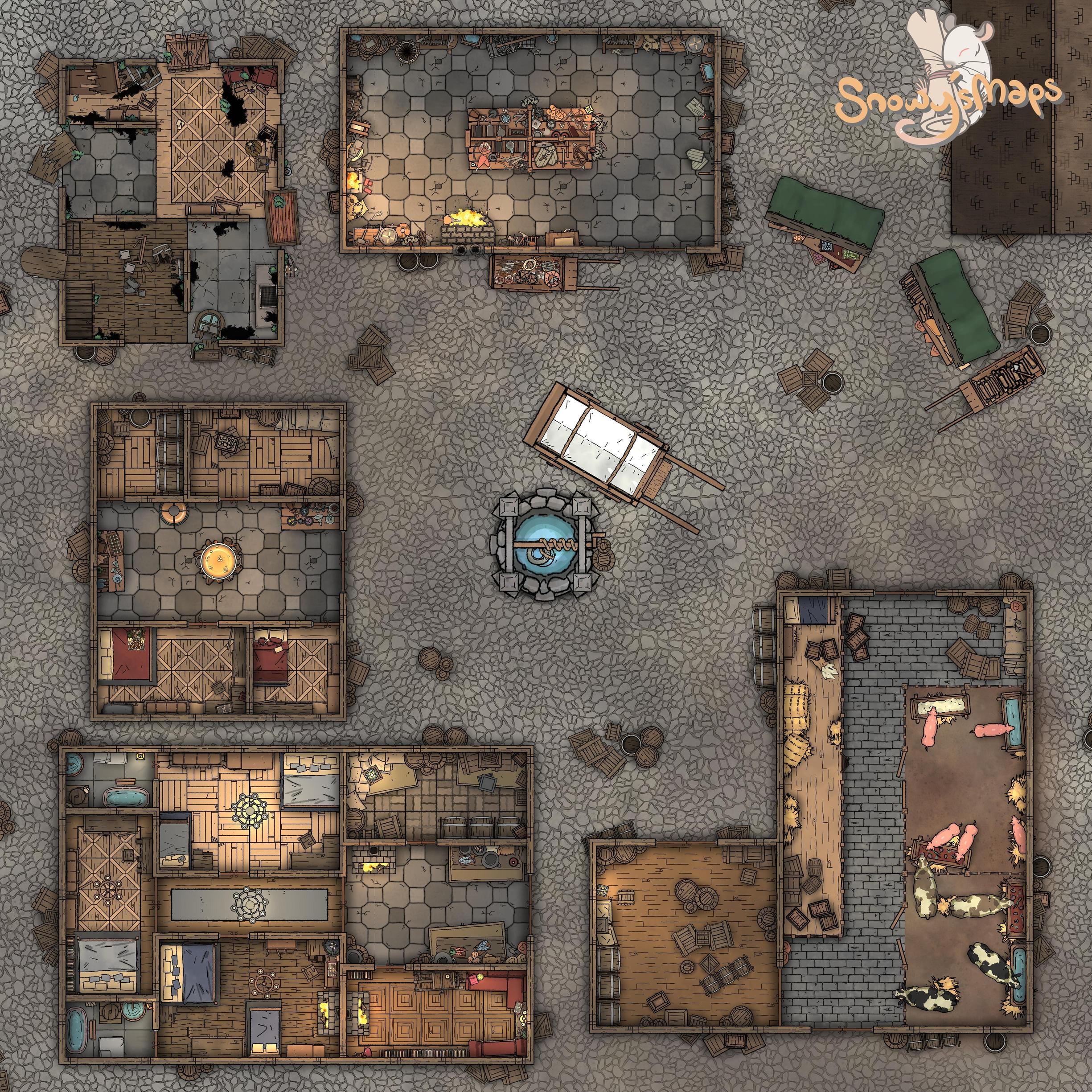 Hey there! Today I am sharing one of my maps as part of my City set of maps. This pack all in all includes: a few shops in the city centre (mini market, shops and adventurer starter house), generic city streets, city warehouse by a river, and an airship crash. Enjoy!
